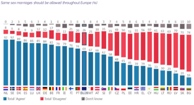 Σε ότι αφορά τον γάμο μεταξύ ατόμων του ίδιου φύλου σε ολόκληρη την Ευρώπη, οι Έλληνες είναι αρνητικοί σε ποσοστό 56%, υπερδιπλάσιο σε σχέση με τον μέσο όρο της Ευρώπης (26%). Αξίζει να σημειωθεί ότι το ποσοστό στην Ελλάδα είναι κατά έξι ποσοστιαίες μονάδες χαμηλότερο σε σχέση με την αντίστοιχη έρευνα που είχε πραγματοποιηθεί το 2015.