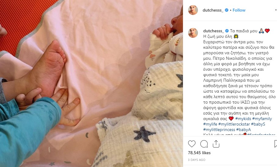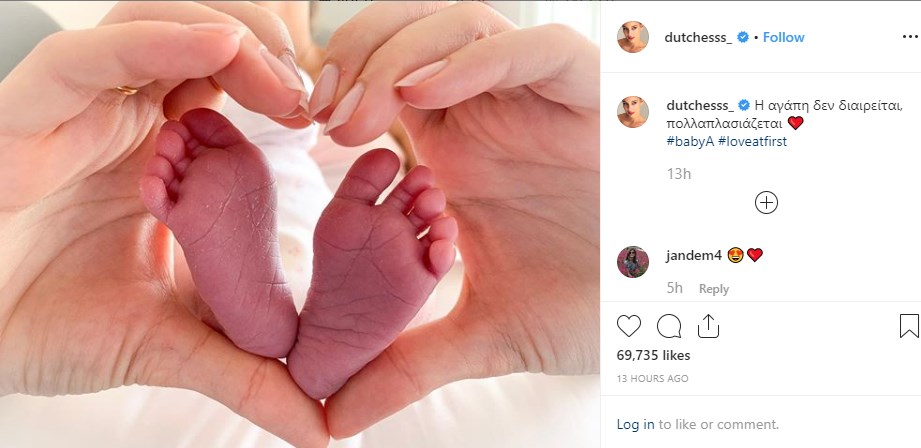 Έκανε τα χέρια της σε σχήμα καρδιάς και μέσα έβαλε τα πατουσάκια της μικρής γράφοντας στη λεζάντα: «Η αγάπη δε διαιρείται, πολλαπλασιάζεται».