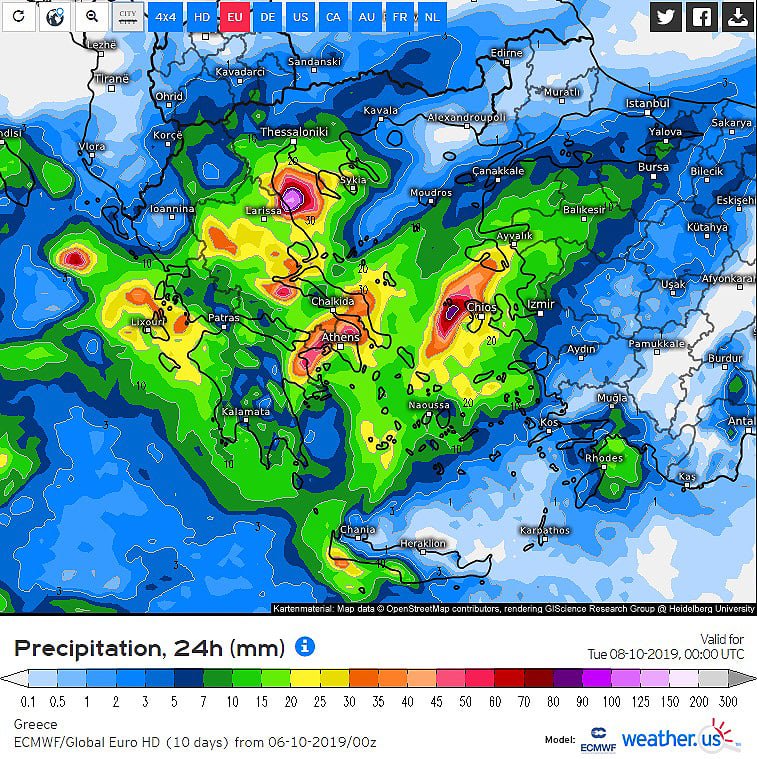 Όπως αναφέρει ο μετεωρολόγος Γιάννης Καλλιάνος, επικαλούμενος τον χάρτη από το προγνωστικό μοντέλο ECMWF, και στην Αττική αναμένονται αρκετά μεγάλα ύψη βροχής.