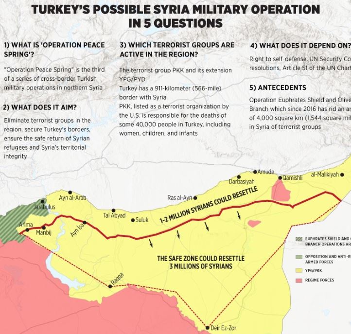 Σύμφωνα με την τουρκική εφημερίδα Hürriyet, σε πρώτη φάση η Τουρκία στοχεύει να πάρει τον έλεγχο μιας περιοχή στα σύνορα μήκους 120 χλμ και βάθους περίπου 30 χλμ, που εκτείνεται από την Τελ Αμπιάντ έως τη Ρας αλ Άιν.