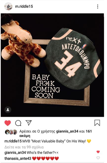 Τα σχόλια κάτω από την αποκαλυπτική ανάρτηση έπεσαν βροχή με τον Γιάννης να ρωτάει χιουμοριστικά «ποιος είναι ο πατέρας» ενώ ο μέλλοντας θείος Θανάσης Αντετοκούνμπο έστειλε καρδούλες.