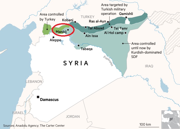 Χθες Δευτέρα, ο Συριακός Αραβικός Στρατός ανακοίνωσε ότι οι δυνάμεις τους είχαν εισέλθει στο Mανμπίζ μετά την αποχώρηση των αμερικανικών ενόπλων δυνάμεων από την πόλη νωρίτερα το πρωί.