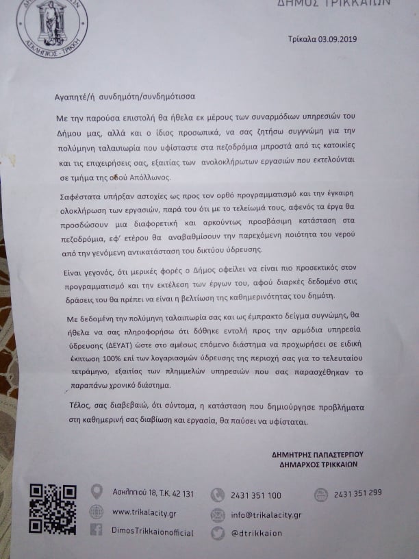 Με επιστολή που φέρνει σήμερα στη δημοσιότητα το trikalavoice.gr, εκτός της συγνώμης, τους κάνει γνωστό ότι απαλλάσσονται με δικιά του προσωπική απόφαση να προχωρήσει σε έκπτωση 100% των λογαριασμών τους στη ΔΕΥΑΤ.