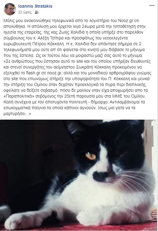 «Mου ανακοινώθηκε τηλεφωνικά από το λογιστήριο του Nooz.gr οτι απολύθηκα. Η απόλυση μου έρχεται λιγα 24ωρα μετά την τοποθέτηση στην ηγεσία της εταιρείας, της κας Ζωης Χαλιδιά η οποία υπήρξε στο παρελθον σύμβουλος του κ. Αλέξη Τσίπρα και προσφάτως του νεοεκλεγέντα ευρωβουλευτή Πέτρου Κόκκαλη. Η κ. Χαλιδιά δεν απάντησε σήμερα σε 2 τηλεφωνήματά μου ούτε απ ότι φαίνεται στο κινητό μου διάβασε το μήνυμα που της έστειλα. Ως εκ τούτου λέω να μοιραστώ μαζί σας αυτό το μήνυμα: