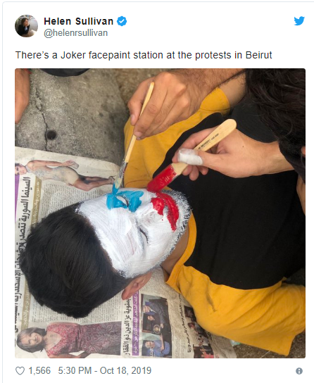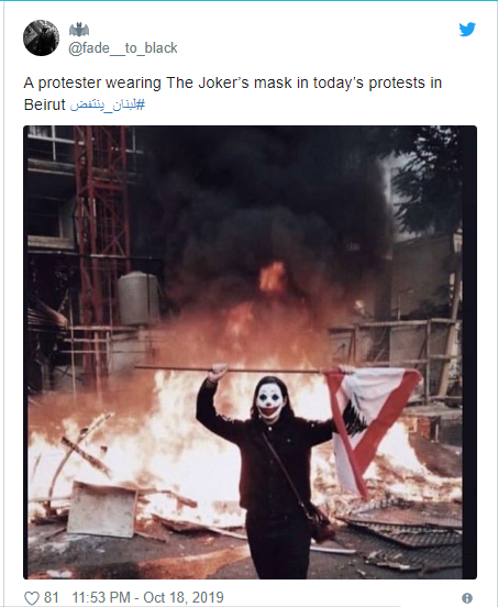 Ομοίως, όπως αναφέρεται και στον ιστότοπο International Business Times, στη Βηρυτό όπου εκτυλίσσονται αντίστοιχες ταραχές και βίαιες συγκρούσεις με την αστυνομία, υπήρχε σημείο όπου οι αντικυβερνητικοί διαδηλωτές έβαζαν σε άλλους διαδηλωτές το αναγνωρίσιμο μέικ-απ του αντιπάλου του Μπάτμαν.