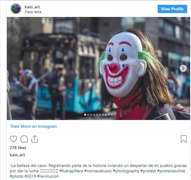Εθεάθη πριν από δυο ημέρες στο Σαντιάγο της Χιλής που βρίσκεται σε κατάσταση έκτακτης ανάγκης, με κάποιους από τους διαδηλωτές, όπως αναφέρει ο ιστότοπος Hotinfornow.com και το τηλεοπτικό δίκτυο TVN, να φορούν μέικ-απ κλόουν, και μάσκες όπως αυτές στην ταινία Τζόκερ, και κυριολεκτικά να επαναλαμβάνουν εν γνώσει τους στους δρόμους συγκεκριμένες σκηνές από την κορύφωση του φιλμ.
