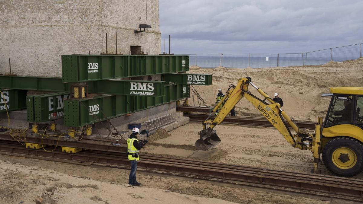 A 120-year-old lighthouse in Denmark was moved 60 meters away from the cliff edge to prevent it toppling in the sea due to coastline erosion. pic.twitter.com/n7TjpLHBFI
