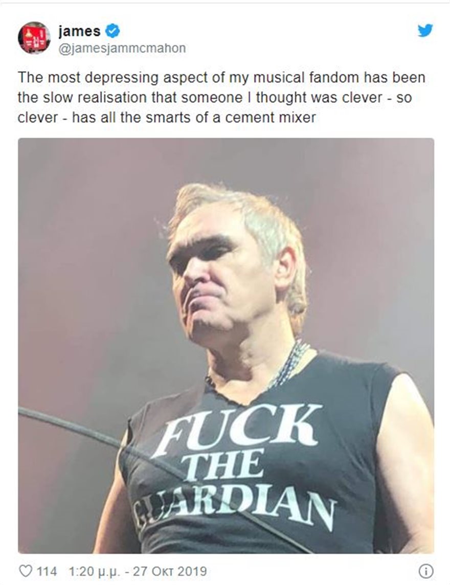 Σφοδρή επίθεση εναντίον της βρετανικής εφημερίδας Guardian εξαπέλυσε ο τραγουδιστής Μόρισεϊ, φορώντας μαύρη μπλούζα στην οποία αναγραφόταν η προσβλητική φράση «Fuck the Guardian».