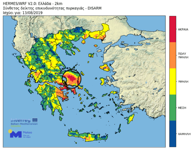 Εικόνα 4. Πρόγνωση σύνθετου δείκτη επικινδυνότητας DISARM για την 13η Αυγούστου 2019. Με τον μαύρο κύκλο, σε μεγέθυνση, φαίνεται η περιοχή ακραίας επικινδυνότητας όπου εκδηλώθηκε η μεγαλύτερη πυρκαγιά της φετινής αντιπυρικής περιόδου.