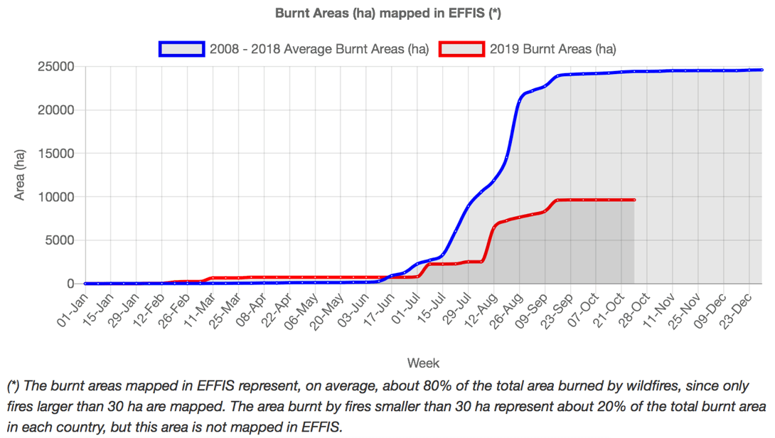 Θετικός είναι ο απολογισμός της φετινής αντιπυρικής περιόδου, 3 ημέρες πριν και την τυπική της λήξη (01/05 – 28/10/2019), όπως προκύπτει από τα δεδομένα που συλλέγει και επεξεργάζεται το European Forest Fire Information System (EFFIS – http://effis.jrc.ec.europa.eu). Με βάση τα δεδομένα αυτά, τα οποία παρουσιάζονται στην επόμενη εικόνα (Εικόνα 1), η συνολική έκταση που κάηκε στη χώρα μας από 01/05 έως και 27/10/2019 ανέρχεται σε 88.980 στρέμματα, ίση με το 1/3 περίπου του μέσου όρου της περιόδου 2008-2018 (243030 στρέμματα).