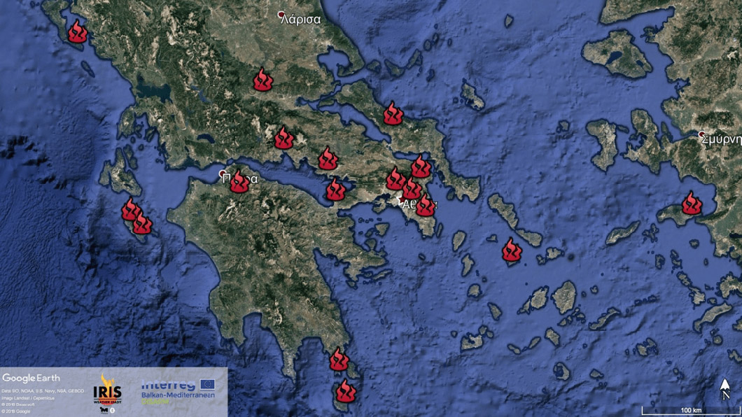 Στο πλαίσιο της φετινής αντιπυρικής περιόδου (01/05 – 28/10/2019) εφαρμόστηκε επίσης, για πρώτη φορά επιχειρησιακά, το προγνωστικό σύστημα IRIS, το οποίο παρείχε κατ’ αίτηση (on demand) προγνώσεις εξάπλωσης πυρκαγιών. Ειδικότερα, για το διάστημα από 01/05 έως και 28/10/2019, το σύστημα IRIS ενεργοποιήθηκε από το Ενιαίο Συντονιστικό Κέντρο Επιχειρήσεων (ΕΣΚΕ) του Πυροσβεστικού Σώματος σε 17 περιστατικά πυρκαγιών, με σκοπό την παροχή προγνώσεων εξάπλωσης για τις επόμενες 6/24 ώρες. Οι θέσεις των πυρκαγιών για τις οποίες ενεργοποιήθηκε φέτος το προγνωστικό σύστημα IRIS παρουσιάζονται στην επόμενη εικόνα (Εικόνα 2).