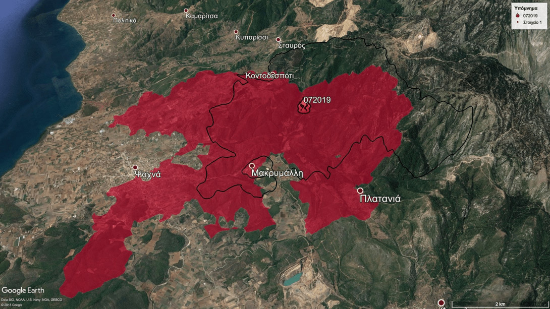 Από το σύνολο των 17 πυρκαγιών για τις οποίες το προγνωστικό σύστημα IRIS παρείχε προγνώσεις εξάπλωσης στο ΕΣΚΕ, το σημαντικότερο περιστατικό ήταν αναμφίβολα η πυρκαγιά που εκδηλώθηκε τα ξημερώματα της 13ης Αυγούστου 2019 στην Κ. Εύβοια, ανάμεσα στα χωριά Κοντοδεσπότι και Μακρυμάλλη. Η συγκεκριμένη δασική πυρκαγιά είχε ως αποτέλεσμα να καούν συνολικά 28890 στρέμματα (εκτίμηση με βάση το EFFIS), με τον καπνό από τη φωτιά να φτάνει μέχρι την Αττική, δημιουργώντας προβλήματα λόγω υποβάθμισης της ποιότητας του αέρα. Στην επόμενη εικόνα παρουσιάζεται η σύγκριση της προβλεφθείσας από το IRIS τελικής περιμέτρου της πυρκαγιάς με την αντίστοιχη πραγματική, με βάση δορυφορικά δεδομένα MODIS που ανακτήθηκαν από το EFFIS (Εικόνα 3). Από τα 28890 στρέμματα που κάηκαν πραγματικά, το προγνωστικό σύστημα IRIS προέβλεψε σωστά τα 18120 στρέμματα (συμφωνία 63%), προβλέποντας ορθά την εξάπλωση της πυρκαγιάς νότια, προς τα Ψαχνά, και υποεκτιμώντας την εξάπλωση προς βορρά. Σε αυτό το σημείο, θα πρέπει να σημειωθεί ότι κατά την εφαρμογή του IRIS δεν λαμβάνεται υπόψη η πυρόσβεση. Υπό αυτή την έννοια, οι προγνώσεις του IRIS παρέχουν το χείριστο σενάριο εξάπλωσης, όπου η φωτιά προχωρά ανεξέλεγκτη. Η επιστημονική ομάδα του Εθνικού Αστεροσκοπείου Αθηνών (ΕΑΑ) αξιολογεί το σύνολο των 17 πυρκαγιών ώστε να εντοπιστούν τα συστηματικά σφάλματα στην πρόγνωση εξάπλωσης και τα οποία, στο μέτρο του επιστημονικά δυνατού, θα διορθωθούν για την αντιπυρική περίοδο του 2020.
