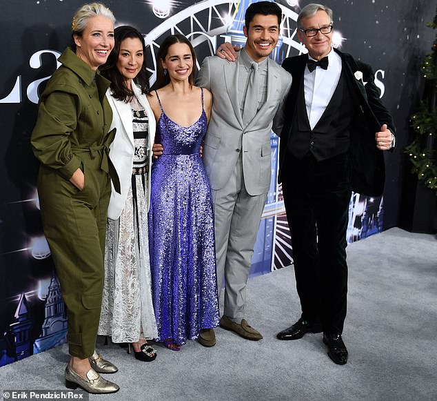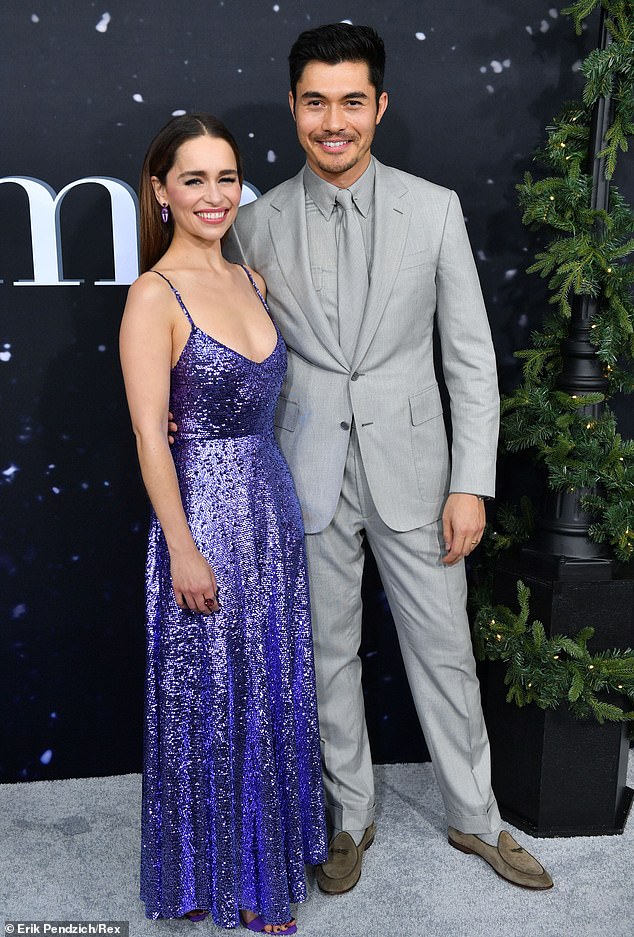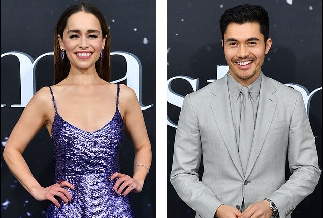 Η Emilia Clarke και ο Henry Golding χαμογελούν, καθώς ποζάρουν στο κόκκινο χαλί της πρεμιέρας της ταινίας Last Christmas στη Νέα Υόρκη το βράδυ της Τρίτης.