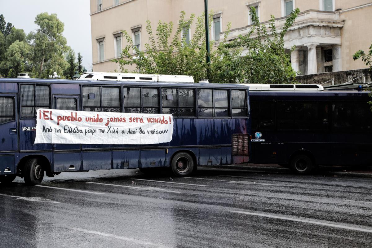 Ένα πανό με το μήνυμα «λαός ενωμένος ποτέ νικημένος» (el pueblo unido jamás será vencido) ανήρτησαν φοιτητές που συμμετείχαν στο πανεκπαιδευτικό συλλαλητήριο στην Αθήνα στις κλούβες των ΜΑΤ μπροστά στη Βουλή.
