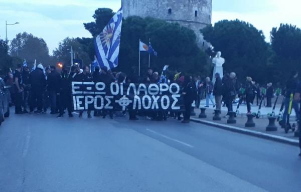 Στην παραλία στο ύψος του Λευκού Πύργου, μπροστά από το άγαλμα του ναυάρχου Βότση, πραγματοποίησαν συγκέντρωση διαμαρτυρίας κατά προσφύγων και μεταναστών εθνικιστές.