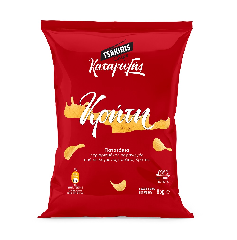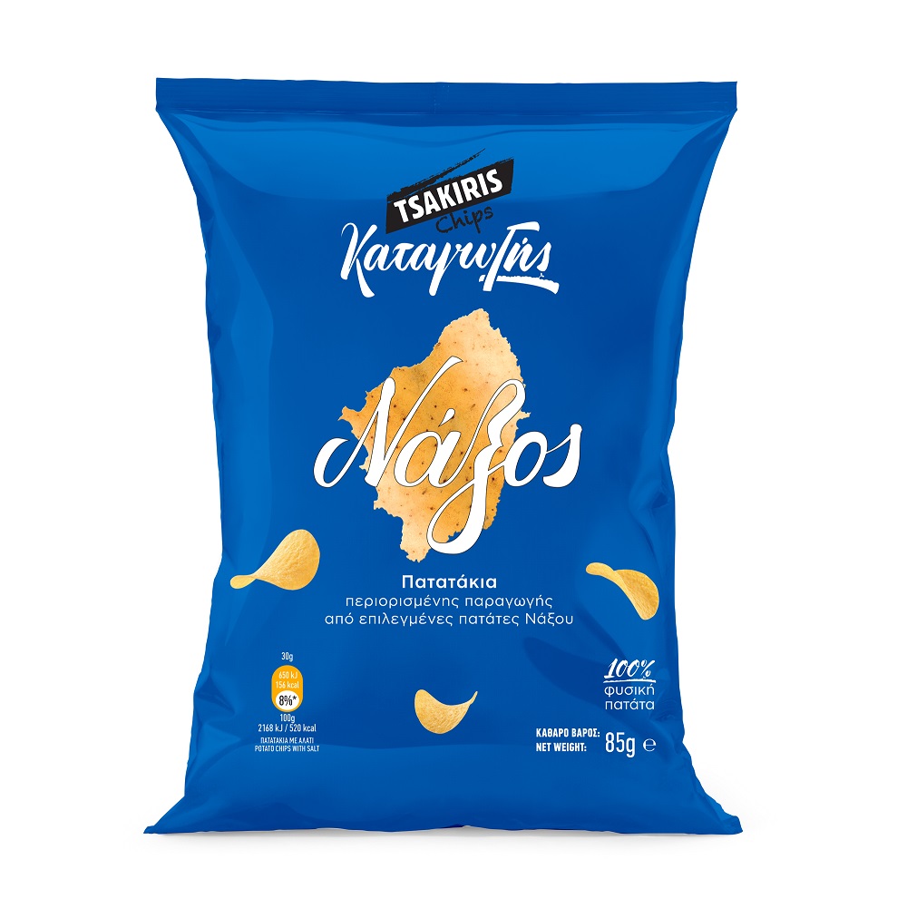 Η TSAKIRIS όμως δε σταματάει εδώ τις εκπλήξεις, καθώς μας συστήνει μια ακόμη καινοτομία, τα περιορισμένης παραγωγής TSAKIRIS Chips ΚαταγωΓής από τη Νάξο και την Κρήτη. Η νέα σειρά παράγεται από ξακουστές Ελληνικές σοδειές πατάτας, ενισχύοντας το στοιχείο της ελληνικότητας στα αγαπημένα μας πατατάκια. Οι πατάτες Νάξου, γνωστές για την ποιότητά τους, και οι πατάτες Κρήτης, οι οποίες ξεχωρίζουν για την ιδιαίτερη γεύση τους, προσφέρουν μια μοναδική γευστική εμπειρία με επιπλέον τραγανή υφή.