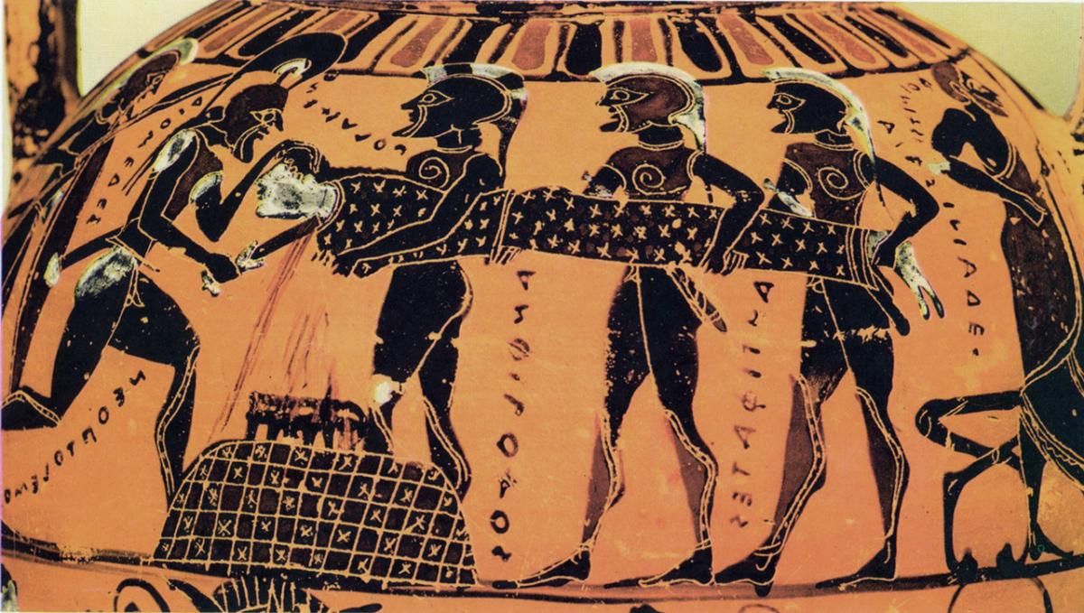 7.Η θυσία της Πολυξένης, θυγατέρας του Πριάμου, όπως εικονίζεται σε μελανόμορφο αμφορέα του Ζωγράφου του Τιμιάδη.