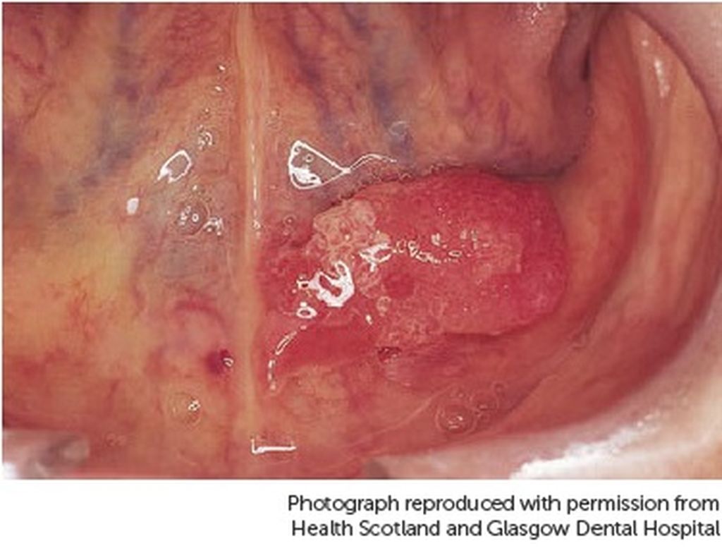 – κόκκινη η λευκή κηλίδα στην επιφάνεια της γλώσσας