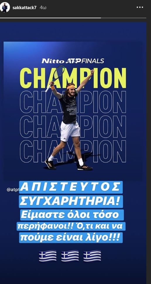 Έκανε μια ανάρτηση στο instagram που τον αποθεώνει για τη νίκη του στον τελικό του ATP στο Λονδίνο: «Απίστευτος, συγχαρητήρια! Είμαστε όλοι τόσο περήφανοι!! Ότι και να πούμε είναι λίγο!!!» έγραψε χαρακτηριστικά η Σάκκαρη.