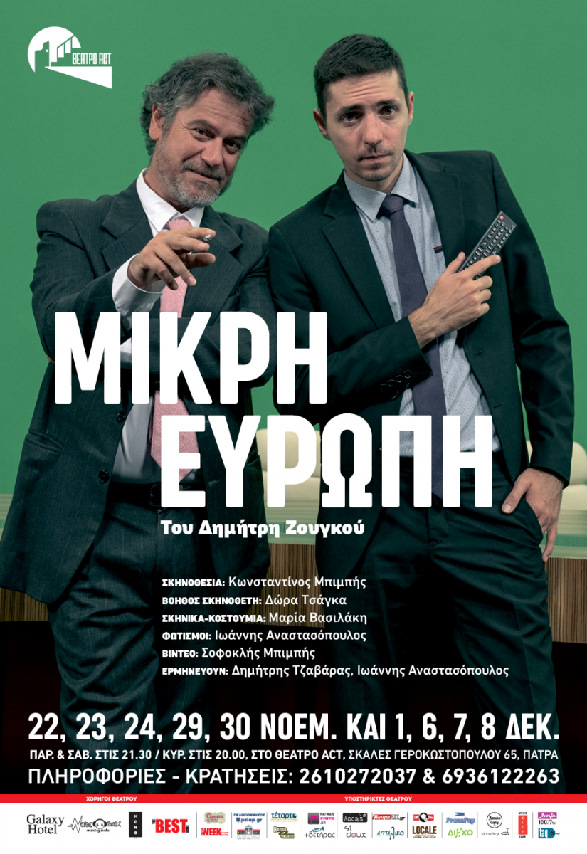Το θέατρο act παρουσιάζει τη νέα του παραγωγή. Πρόκειται για μια επίκαιρη πολιτική κωμωδία του βραβευμένου με το κρατικό βραβείο θεάτρου (το 2008) Δημήτρη Ζουγκού. Τη σκηνοθεσία υπογράφει ο βραβευμένος με βραβείο Χορν (το 2017) ηθοποιός Κωνσταντίνος Μπιμπής. Το έργο έχει τον τίτλο «Μικρή Ευρώπη» και διαδραματίζεται στο στούντιο ενός τηλεοπτικού σταθμού μιας φανταστικής Ελληνικής κωμόπολης. Ερμηνεύουν οι Δημήτρης Τζαβάρας και Ιωάννης Αναστασόπουλος.