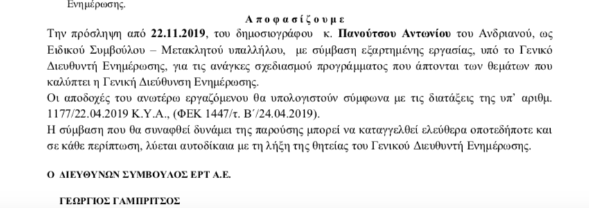 Ο δημοσιογράφος Αντώνης Πανούτσος προσλαμβάνεται ως ειδικός σύμβουλος στην ΕΡΤ στη γενική διεύθυνση ενημέρωσης, με απόφαση που δημοσιεύεται στη Διαύγεια, με απόφαση που υπογράφει ο διευθύνων σύμβουλος  Γιώργος Γαμπρίτσος.