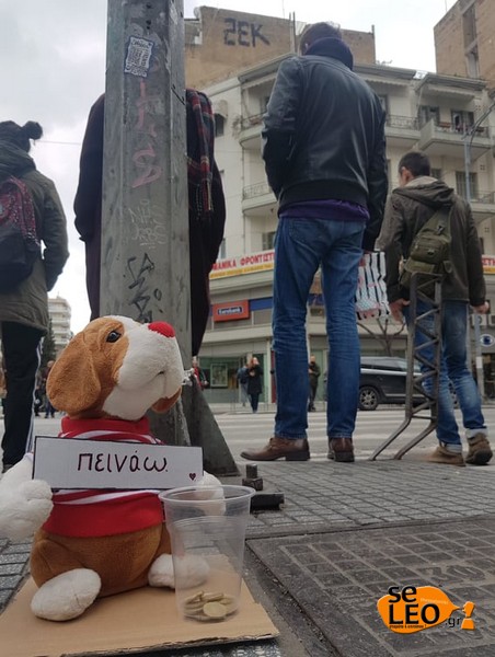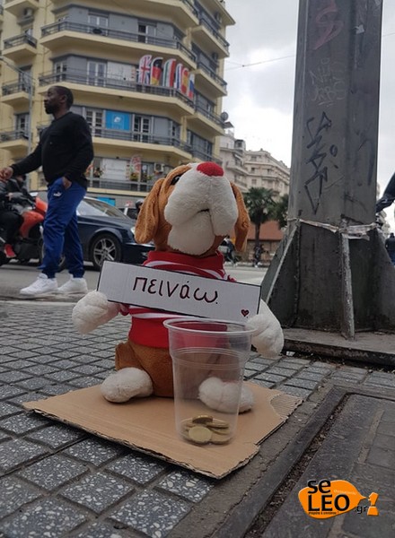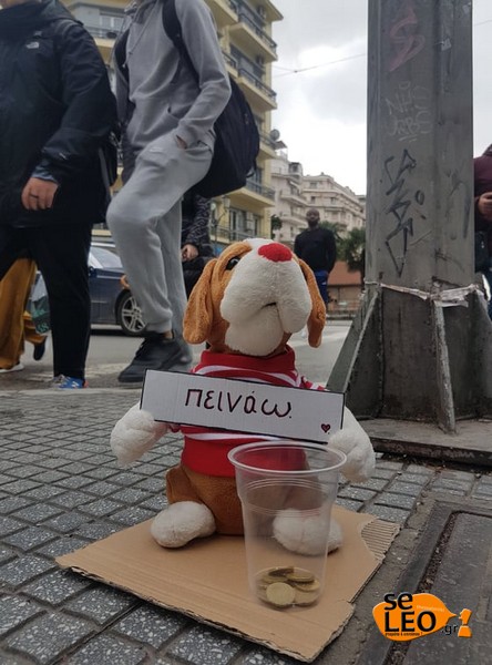 Όπως αναφέρει το seleo.gr, ο σκύλος -κουκλάκι έχει τοποθετηθεί μπροστά από τα φανάρια που βρίσκονται στο σημείο, εκεί όπου πλήθος πεζών περιμένουν να ανάψει το πράσινο για να περάσουν στην απέναντι πλευρά του δρόμου. Το λούτρινο κρατάει ένα χάρτινο σημείωμα που γράφει ‘’πεινάω’’ και μπροστά του έχει ένα πλαστικό ποτήρι στο οποίο περαστικοί του αφήνουν χρήματα.