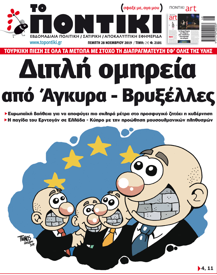 Με πρωτοσέλιδο τίτλο «Διπλή ομηρεία από Άγκυρα-Βρυξέλλες» και αναλυτικό-αποκαλυπτικό ρεπορτάζ για την τουρκική πίεση σε όλα τα μέτωπα και την ευρωπαϊκή βοήθεια που ζητά η κυβέρνηση για να αποφύγει πιο σκληρά μέτρα στο προσφυγικό, κυκλοφορεί το «ΠΟΝΤΙΚΙ» το πρωί της Πέμπτης.