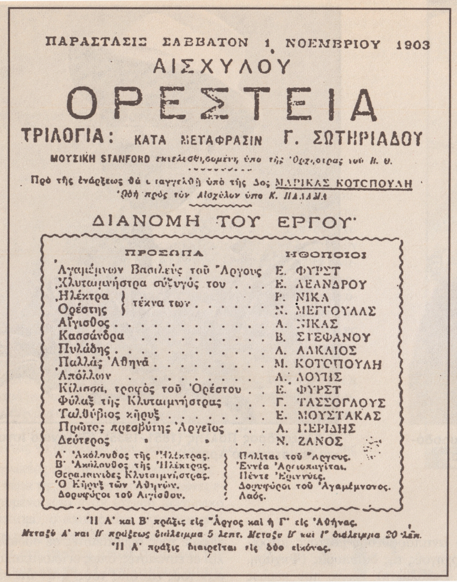 Η ιστορική αυτή παράσταση, καθώς όπως ανέφερε εφημερίδα της εποχής παρουσιαζόταν ύστερα από 2.461 χρόνια, ανέβηκε από το Βασιλικόν (Εθνικό σήμερα) Θέατρο, το οποίο χρηματοδοτούσε ο βασιλιάς Γεώργιος Α’. Για να γίνουν ωστόσο κατανοητές οι έντονες αντιδράσεις που ακολούθησαν, πρέπει να λάβουμε υπό όψη ότι στα τέλη του 19ου αιώνα και στις αρχές του 20ού, το γλωσσικό ζήτημα συνδεόταν με πολιτικοκοινωνικές και «εθνικές» ιδεολογίες, όπως εξακολουθεί να ισχύει ακόμα και στις μέρες μας, όταν αυτό εκδηλώνεται σε κάθε αφορμή. Την εποχή εκείνη, ωστόσο, το γλωσσικό γινόταν αντιληπτό ως η βασικότερη παράμετρος της εθνικής μας ταυτότητας και συνδέονταν στενά με τον μεγαλοϊδεατισμό της χώρας και την αντίληψη ότι οι γλωσσικές «απώλειες» και «εκπτώσεις» τραυμάτιζαν την εθνική μας υπόσταση. Οι γλωσσικές απώλειες ταυτίζονταν λίγο πολύ με τις εθνικές – εδαφικές απώλειες.