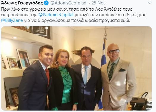 Στις 25 Νοεμβρίου ο υπουργός Ανάπτυξης και Επενδύσεων Άδωνις Γεωργιάδης συναντήθηκε με τους εκπροσώπους της Parkpine Capital. «Πριν λίγο στο γραφείο μου συνάντησα, από το Λος Άντζελες, τους εκπροσώπους της Parkpine Capital μεταξύ των οποίων και ο δικός μας Billy Zane για να διοργανώσουμε πολλά ωραία πράγματα εδώ», έγραψε στο Twitter.