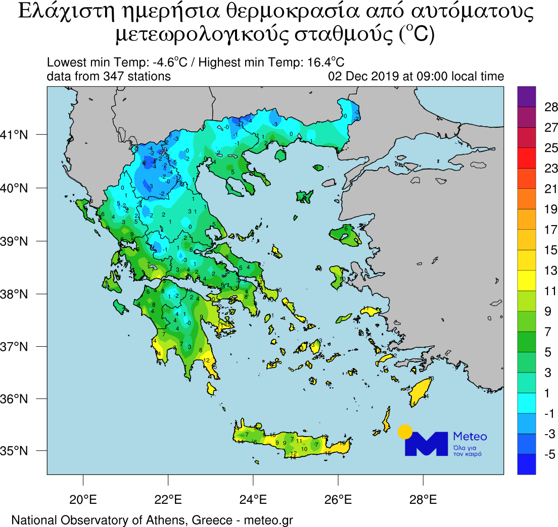Όπως φαίνεται σε αυτόν, η ελάχιστη θερμοκρασία της ημέρας σημειώθηκε στο Μέσοβουνο Κοζάνης και ήταν ίση με -4.6 βαθμούς Κελσίου, ενώ ακολούθησαν το Νευροκόπι Δράμας και η Βλάστη Κοζάνης με -4.4 βαθμούς Κελσίου. Υπενθυμίζεται ότι στον πίνακα δεν περιλαμβάνονται οι σταθμοί που λειτουργούν σε χιονοδρομικά κέντρα και καταφύγια.