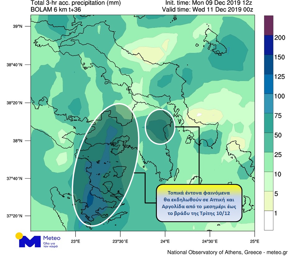 Στις περιοχές όπου θα εκδηλωθούν τοπικά ισχυρές βροχές και καταιγίδες κατά τη διάρκεια της Τρίτης (μετά το μεσημέρι έως και το βράδυ) συμπεριλαμβάνονται ο νομός Αττικής και η πόλη της Αθήνας. Αργά το βράδυ τα φαινόμενα πρόσκαιρα θα σταματήσουν. Στον προγνωστικό χάρτη που ακολουθεί παρουσιάζονται οι αθροιστικές ποσότητες υετού (βροχές/καταιγίδες) της “Διδούς”, έως τις βραδινές ώρες της Τρίτης 10/12 στην Αττική.