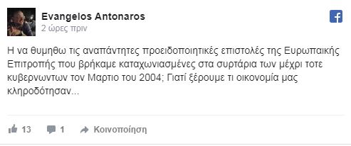 Με δύο αναρτήσεις στο Facebook σχολίασε ο Ευάγγελος Αντώναρος το άρθρο του πρώην πρωθυπουργού Κώστα Σημίτη στα «Νέα Σαββατοκύριακο» για τα ελληνοτουρκικά με τίτλο: «Για όλα φταίει ο Καραμανλής».