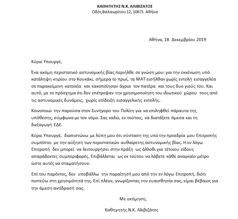 Σκληρή επιστολή με αφορμή τα σημερινά νέα περιστατικά αστυνομικής βίας στο Κουκάκι απέστειλε στον υπουργό Δημόσιας Τάξης Μιχάλη Χρυσοχοΐδη ο επικεφαλής της επιτροπής για τη Διερεύνηση της Αστυνομικής Βίας Νίκος Αλιβιζάτος.
