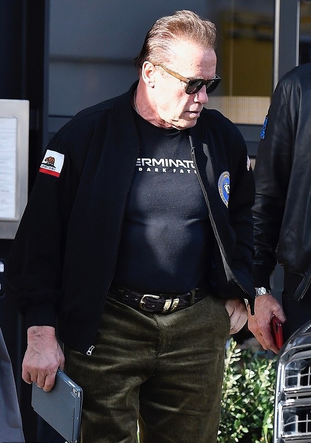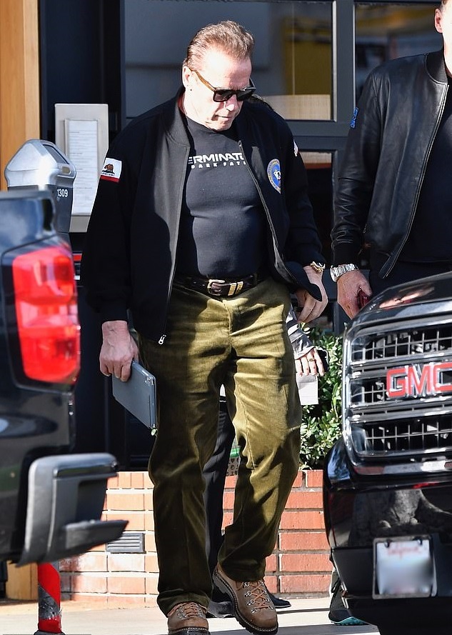 Και την Τρίτη το απόγευμα ο Άρνολντ Σβαρτσενέγκερ φόρεσε το δικό του εμπόρευμα, δηλαδή ένα διαφημιστικό μπλουζάκι του “¨Εξολοθρευτή”.