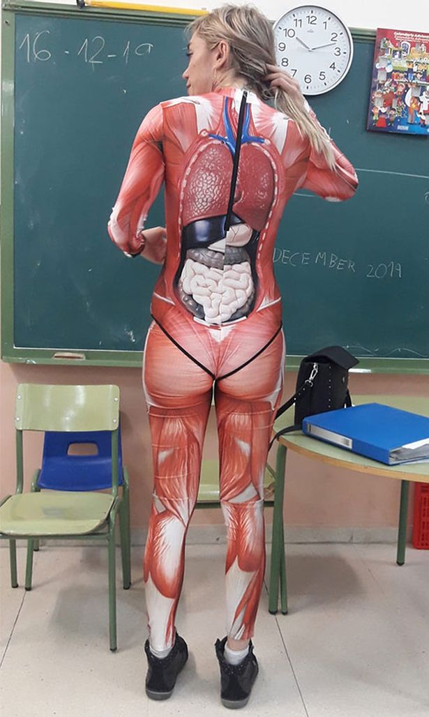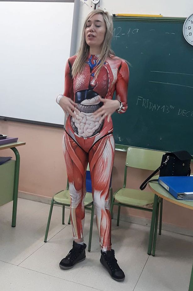 Η Verónica Duque, η οποία διδάσκει εδώ και 15 χρόνια, φόρεσε ένα κοστούμι για να δείξει πού βρίσκεται κάθε όργανο στο σώμα, αφού κατάλαβε ότι οι μαθητές της ηλικίας 8-9 ετών δυσκολεύονταν να κατανοήσουν την έννοια.
