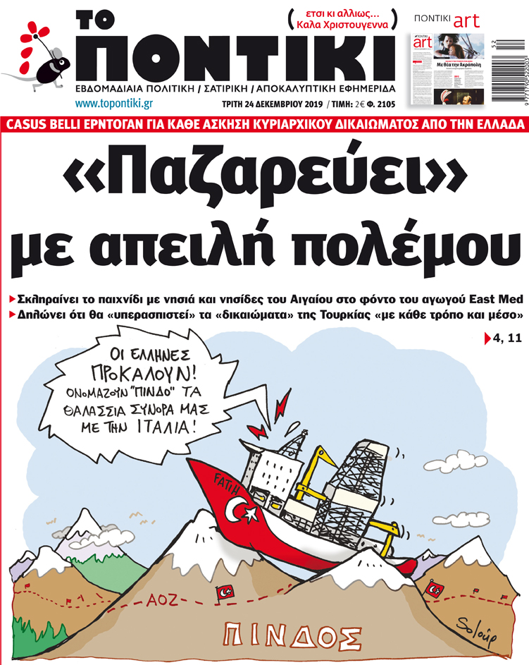 Με πρωτοσέλιδο τίτλο «”Παζαρεύει” με απειλή πολέμου» και αναλυτικό-αποκαλυπτικό ρεπορτάζ για το casus belli του Ερντογάν για κάθε άσκηση κυριαρχικού δικαιώματος από την Ελλάδα, κυκλοφορεί το «ΠΟΝΤΙΚΙ» εκτάκτως το πρωί της Τρίτης, λόγω της αργίας των Χριστουγέννων.