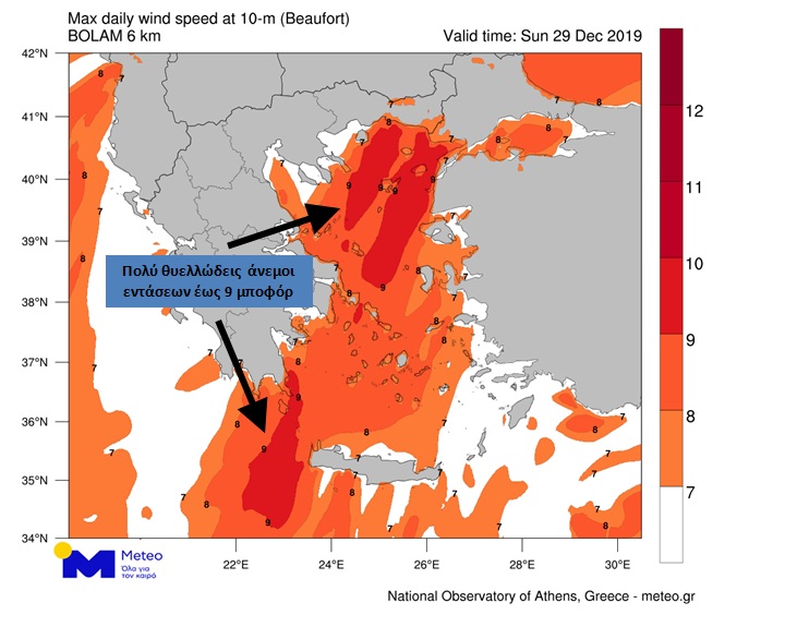 Οι άνεμοι θα πνέουν στο Αιγαίο από βόρειες διευθύνσεις με εντάσεις έως 6 μποφόρ, ενισχυόμενοι έως το βράδυ σε σχεδόν θυελλώδεις έως θυελλώδεις 7 με 8 μποφόρ, ενώ στην Κρήτη και στα Δωδεκάνησα θα πνέουν σχεδόν μέτριοι μεταβλητοί.