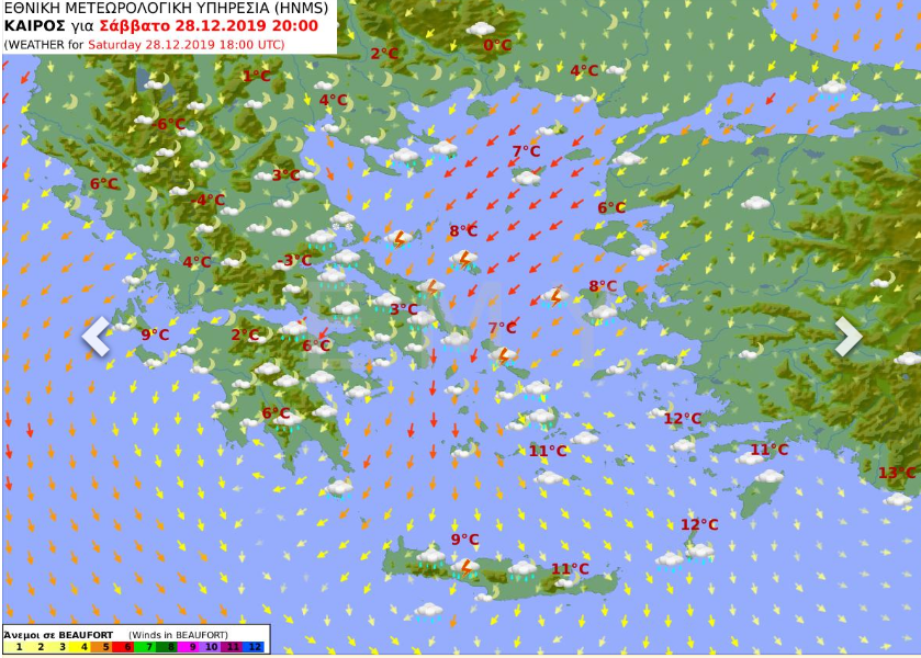 Θερμοκρασία: Από 00 έως 09 βαθμούς Κελσίου. Στη δυτική Μακεδονία 4 με 5 βαθμούς χαμηλότερη.