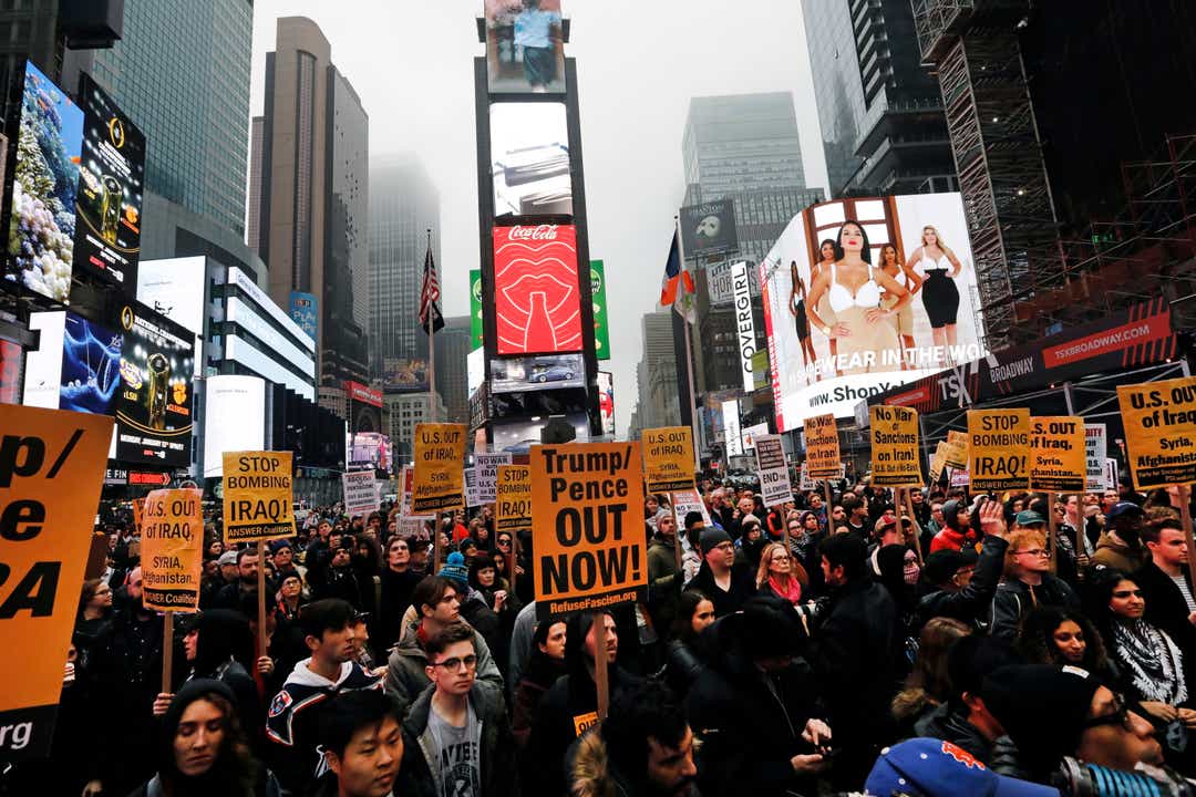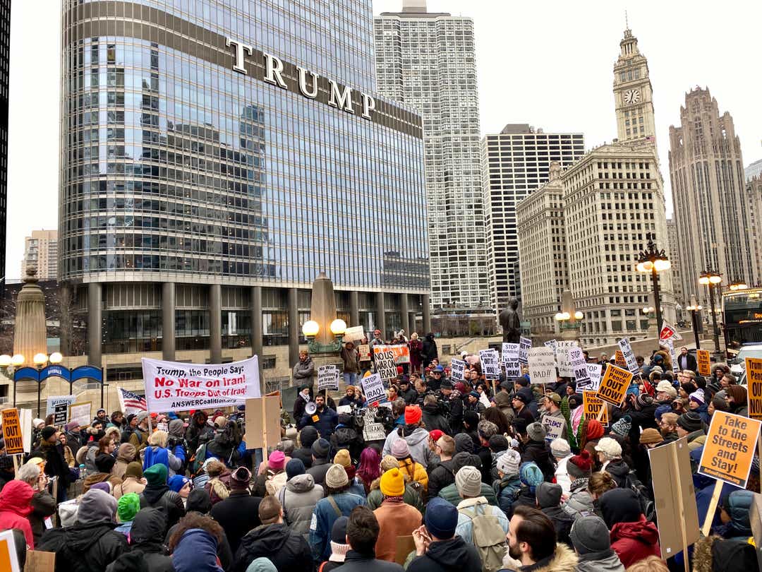 Στην Τάιμς Σκουέρ στη Νέα Υόρκη, διαδηλωτές συγκεντρώθηκαν κρατώντας πανώ με τα οποία ζητούσαν να μην εμπλακεί η χώρα σε έναν πόλεμο με το Ιράν αλλά και να επιστρέψουν οι Αμερικανοί στρατιώτες από το Ιράκ. «Ο πόλεμος δεν είναι στρατηγική επανεκλογής», έγραφε ένα από τα πλακάτ.