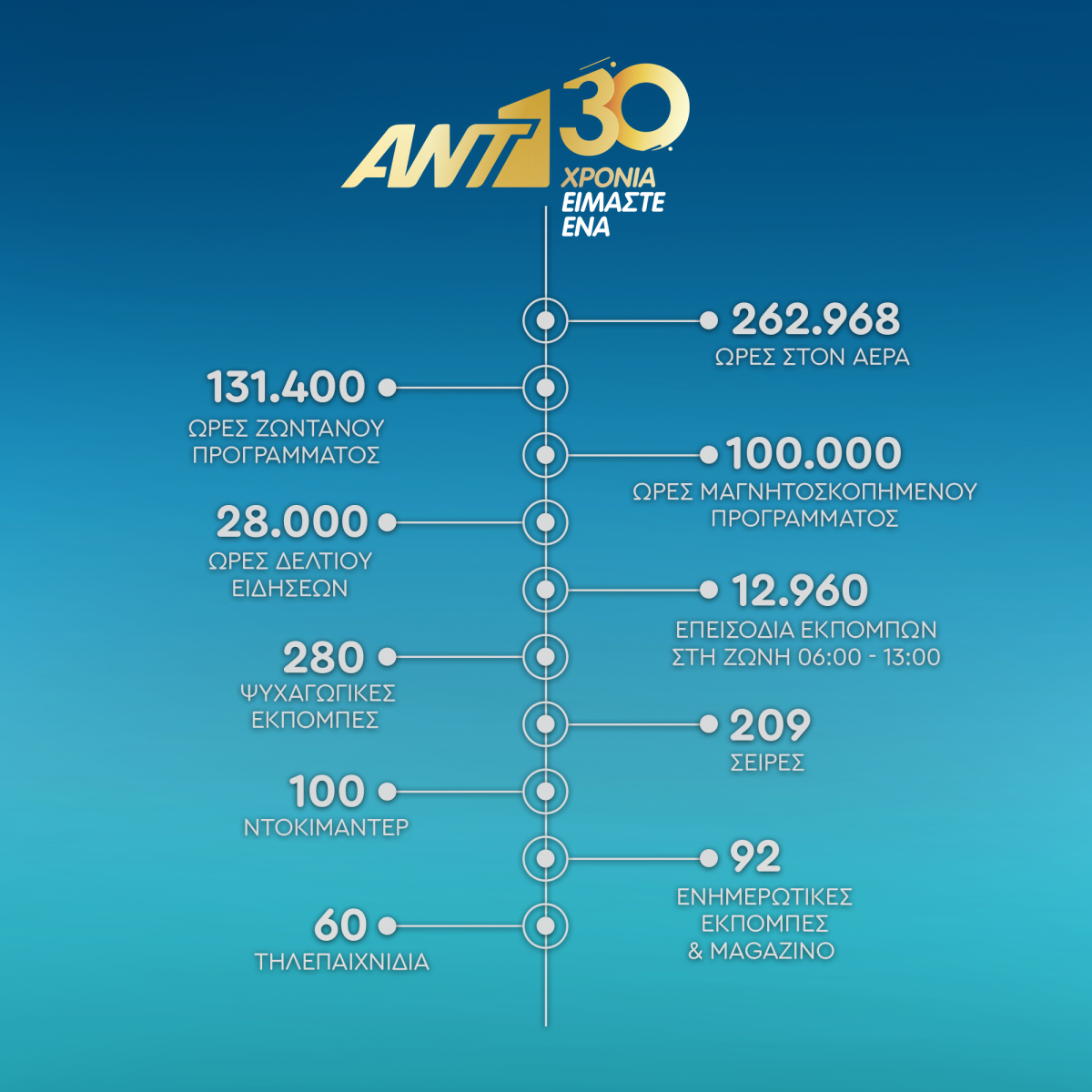 Την επέτειο των 30 χρόνων λειτουργίας του γιορτάζει ο ΑΝΤ1 με μια ανασκόπηση σε… αριθμούς.