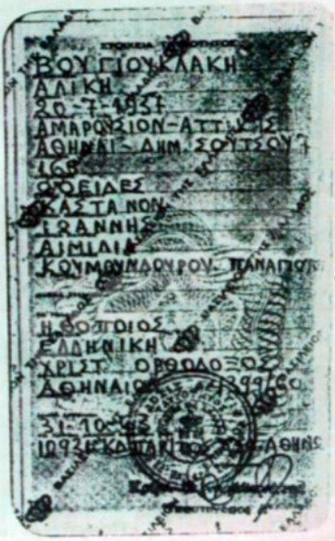 Η ταυτότητά της είχε εκδοθεί στις 31 Οκτώβρη του 1963 και στην πίσω όψη ανέγραφε τα εξής στοιχεία: