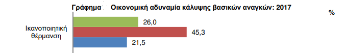 Το ποσοστό των νοικοκυριών που δηλώνουν οικονομική αδυναμία να έχουν ικανοποιητική θέρμανση το χειμώνα ανέρχεται σε 26,0%, ενώ είναι 45,3% για τα φτωχά νοικοκυριά και 21,5% για τα μη φτωχά νοικοκυριά
