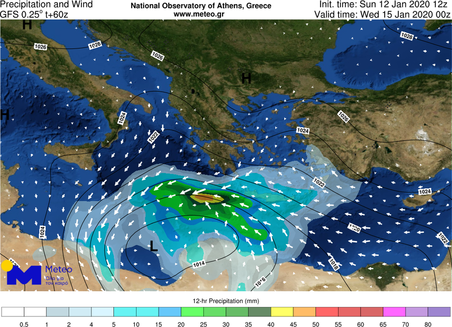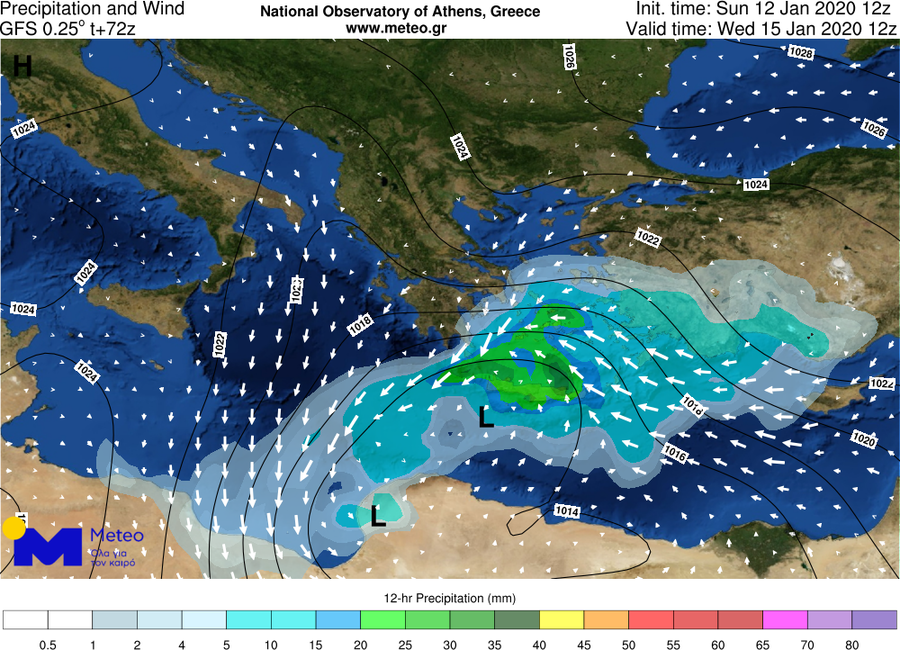 Στους χάρτες που ακολουθούν φαίνεται η θέση του κέντρου του χαμηλού (σημειώνεται με “L”), ο ολικός υετός του προηγούμενου 12ώρου καθώς και το πεδίο των ανέμων για το βράδυ της Τρίτης 14/1 προς Τετάρτη 15/1 και για το μεσημέρι της Τετάρτης 15/1.