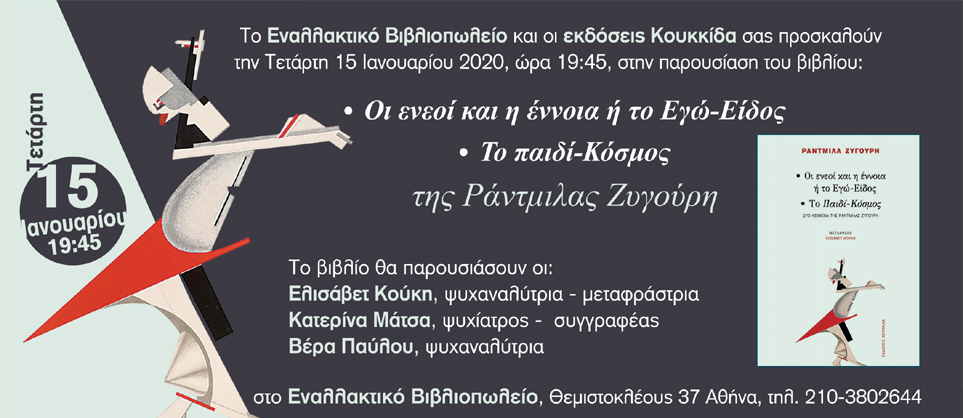Το βιβλίο θα παρουσιάσουν η ψυχαναλύτρια – μεταφράστρια Ελισάβετ Κούκη, η ψυχίατρος – συγγραφέας Κατερίνα Μάτσα και η ψυχαναλύτρια Βέρα Παύλου. Στο Εναλλακτικό Βιβλιοπωλείο, Θεμιστοκλέους 37, Αθήνα, 210 3802644.