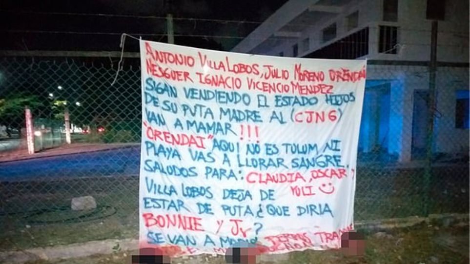 Μπροστά σε ένα αποτρόπαιο θέαμα βρέθηκε μια 22χρονη γυναίκα, η οποια περπατούσε σε δρόμο του τουριστικού θερέτρου Κανκούν, στο Μεξικό, όταν αντίκρισε τρία κομμένα κεφάλια δίπλα σε έναν συρμάτινο φράχτη και κάτω από ένα πανό, που έφερε απειλητικό μήνυμα κατά των αστυνομικών αρχών.