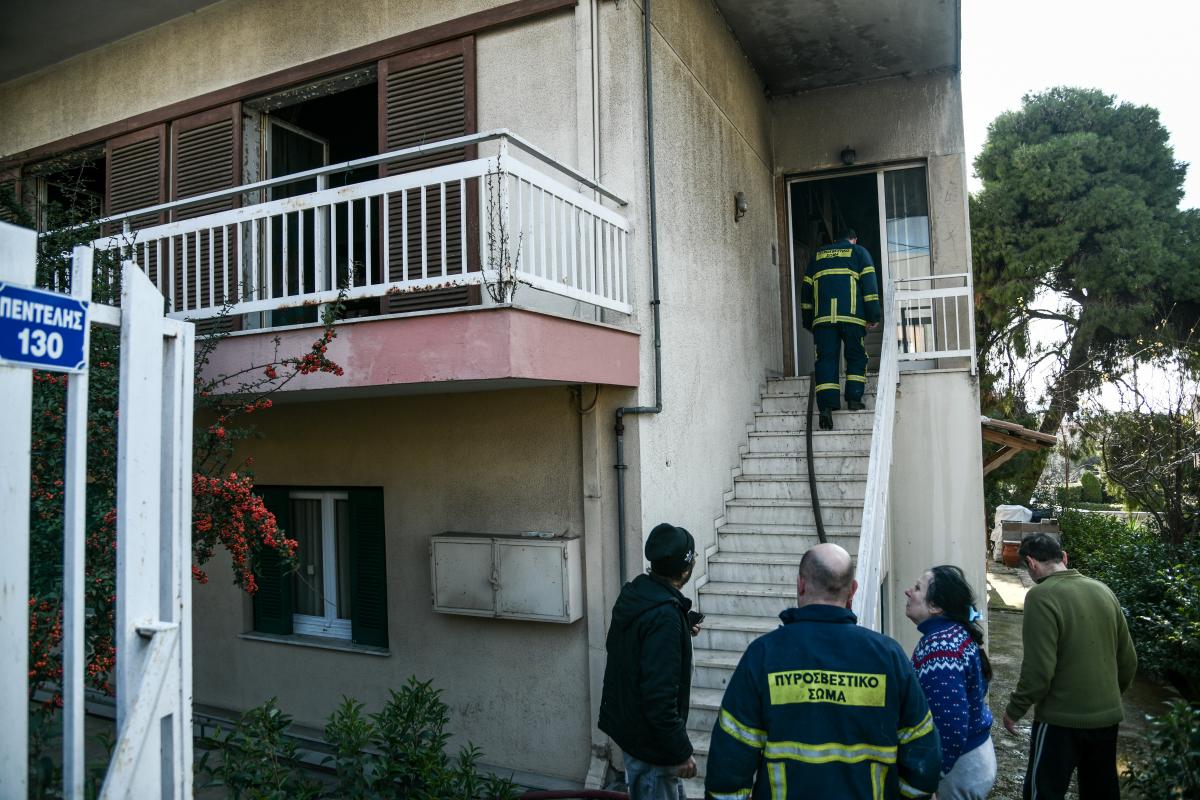 Ήταν το σπίτι πνιγμένο στον καπνό. Μας είπαν οι πυροσβέστες να καθίσουμε σε ένα δωμάτιο. Καθίσαμε εκεί με πετσέτες στο στόμα. Κλείσαμε τον γενικό από μόνοι μας το γνωρίζαμε, κλείσαμε και το φυσικό αέριο και τελικά ήρθε ο ένας πυροσβέστης πάνω», λέει η γυναίκα που παρέμεινε εγκλωβισμένη στον δεύτερο όροφο με το μόλις 18 μηνών εγγονάκι της και τους δύο της γιους.