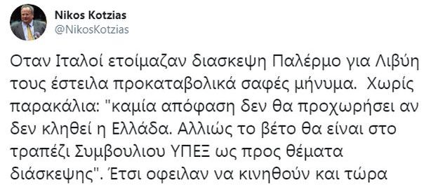 Σε ανάρτησή του στο Twitter, ο Νίκος Κοτζιάς υπογράμμισε ότι «Όταν Ιταλοί ετοίμαζαν διάσκεψη Παλέρμο για Λιβύη τους έστειλα προκαταβολικά σαφές μήνυμα. Χωρίς παρακάλια: “καμία απόφαση δεν θα προχωρήσει αν δεν κληθεί η Ελλάδα. Αλλιώς το βέτο θα είναι στο τραπέζι Συμβουλίου ΥΠΕΞ ως προς θέματα διάσκεψης”. Έτσι όφειλαν να κινηθούν και τώρα».
