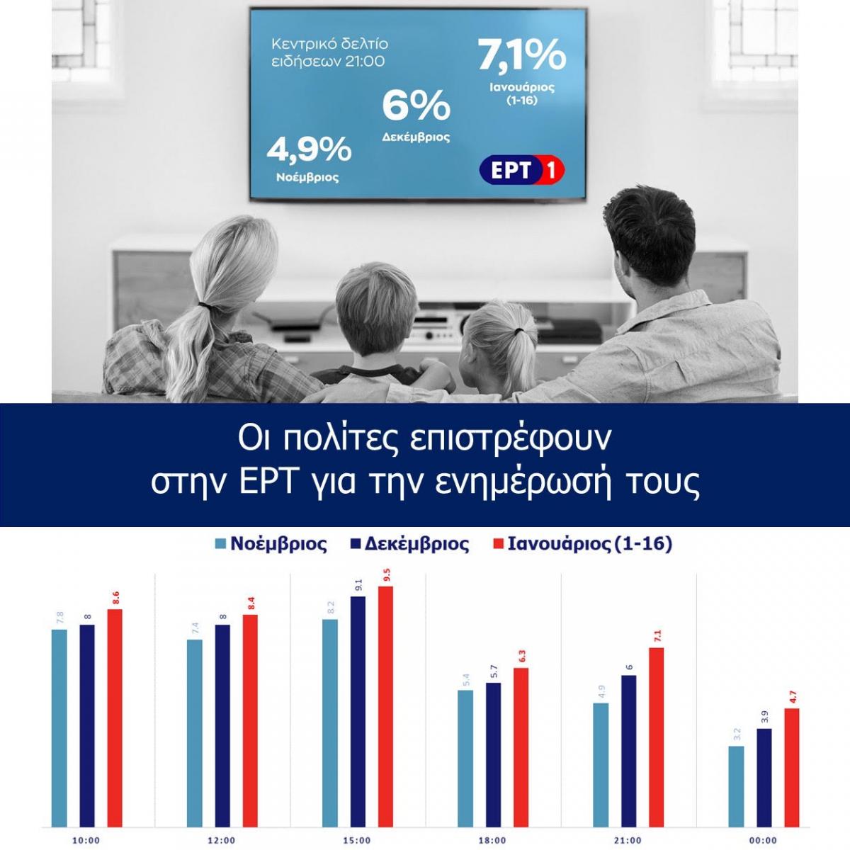 Τα στοιχεία που δίνει σήμερα η ΕΡΤ στη δημοσιότητα είναι τα επίσημα της Nielsen και επομένως δεν χωρούν παρερμηνείες. Είναι εντυπωσιακό ότι όλα ανεξαιρέτως τα δελτία ειδήσεων που μεταδίδει καθημερινά η ΕΡΤ1 (από τις 10 το πρωί ως τα μεσάνυχτα) έχουν συνεχή άνοδο τους τελευταίους 2,5 μήνες, από τον Νοέμβριο μέχρι σήμερα. Στοιχείο που δείχνει ότι οι πολίτες αρχίζουν και επιστρέφουν στη δημόσια τηλεόραση και να την εμπιστεύονται ολοένα και περισσότερο για την ενημέρωσή τους, συνειδητοποιώντας προφανώς την προσπάθεια της νέας διοίκησης να ανατρέψει τις παθογένειες του παρελθόντος και να μη μετατρέπονται τα δελτία ειδήσεων σε προπαγανδιστικό μηχανισμό της κυβέρνησης, όπως κατεξοχήν συνέβη την τελευταία 5ετία.