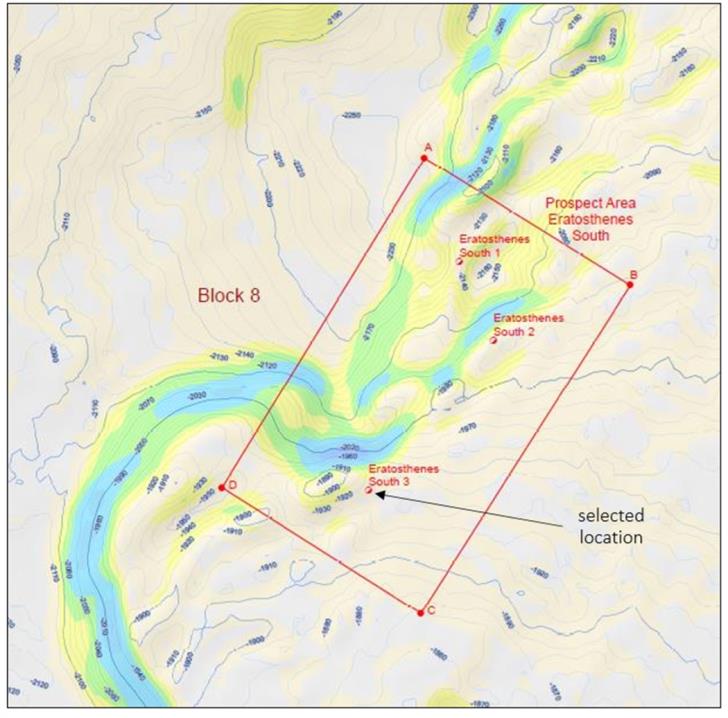Πρόκειται για σημείο, νότια του υποθαλάσσιου όρους “Ερατοσθένης” και στο άκρο του λεγόμενου περι-Ερατοσθένιου δακτυλίου. Περίπου 50 χιλιόμετρα νοτιότερα, εντός του τεμαχίου 9, η ΕΝΙ έχει πραγματοποιήσει γεώτρηση το 2015 – στον στόχο “Ονισήφορος”, χωρίς θετικό αποτέλεσμα.