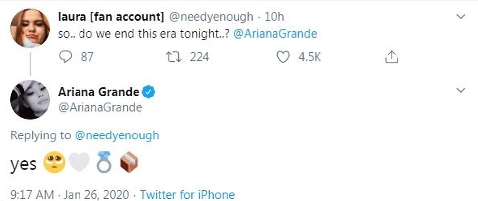 Καθώς το σόου της τελείωνε, η Grande πήγε στο κρεβάτι, όπου έκανε μια παράσταση και τράβηξε το δαχτυλίδι από το δάχτυλό της για να το τοποθετήσει πίσω σε ένα κουτάκι.